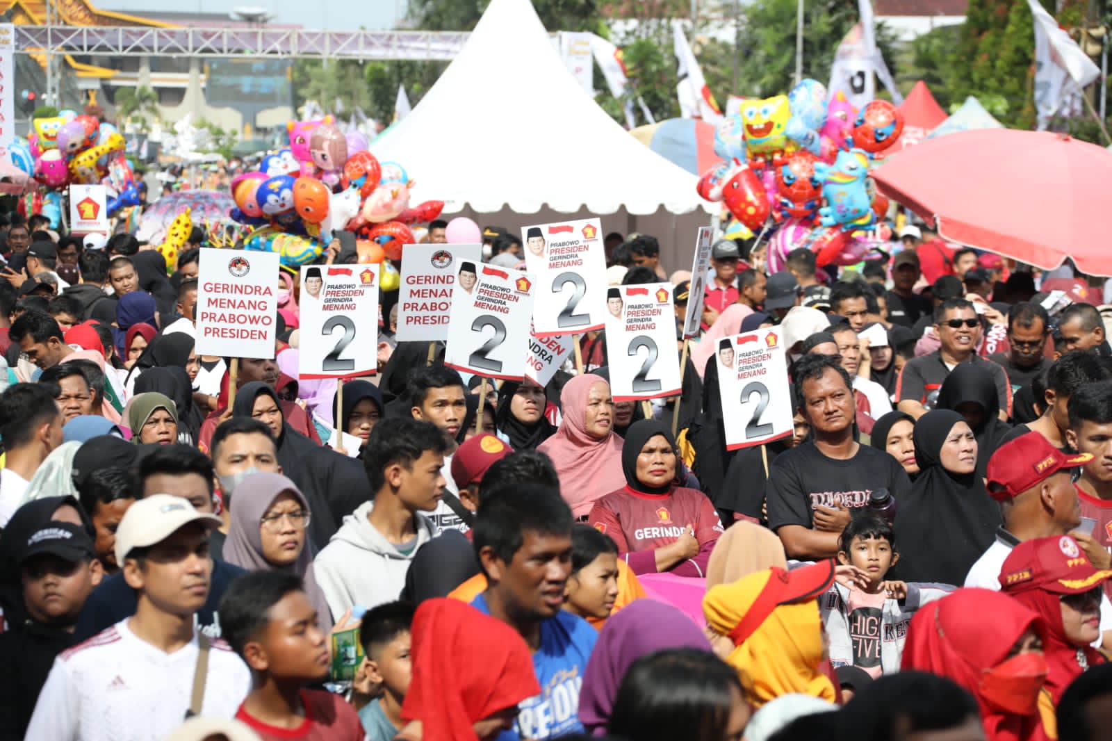 DPD Partai Gerindra Riau menggelar acara jalan sehat dan pesta rakyat dalam rangka memperingati HUT ke-15 Partai Gerindra di Kota Pekanbaru, Riau, Minggu (26/2/2023). Acara ini juga dimeriahkan dengan pembagian doorprize 6 paket umroh, 1 unit mobil, 10 unit motor, sepeda gunung, dan barang-barang elektronik lainnya.